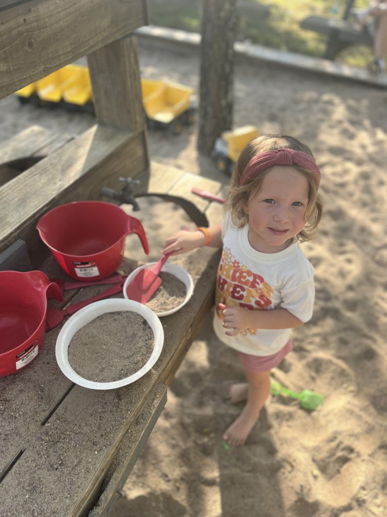Our girls’ attention was instantly stolen by the giant T-Rex at the entrance to the courtyard. “WOW!” they mouthed as they ran over in amazement. My five-year-old made a beeline for the pumpkin slide, laughing at the two giant skeletons posed as if terrified. From there, the girls darted from one attraction to the next, bubbling with excitement. At Adventure Castle, they played princess and queen. At Slide Mountain, my five-year-old bravely zoomed down on her mat, while my three-year-old happily set up shop in the sandpit—making pretend pies and soups for my husband and me. I loved the shaded benches nearby—a little parenting win while they played.