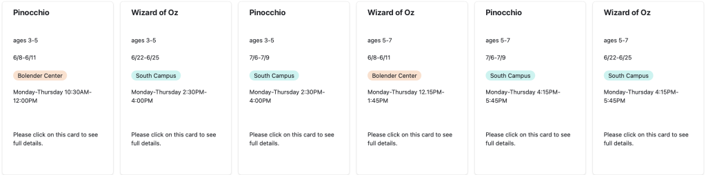 For the Children’s Division, class placement is determined by age to ensure age-appropriate instruction. All levels beyond Pre-Ballet (6-7 years old) require an evaluation prior to enrollment to best support each dancer’s progression.