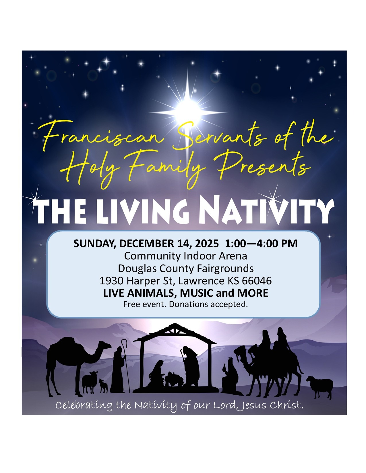 Come experience the joy of the first Christmas. Join us for a Living Nativity at the Douglas County Fairgrounds in Lawrence, KS on Sunday, December 14th from 1:00p – 4:00p. Address is 2120 Harper Street, Lawrence, KS in the Indoor Arena. Featuring a live nativity with animals, music, cookies, and crafts. Admission is free. Donations accepted.