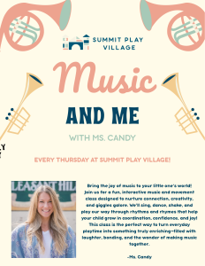 It’s music time at the Village! Music and Me with Ms. Candy brings families together through singing, dancing, and creative play. Watch your little one’s confidence grow as they explore sound, rhythm, and joy!
