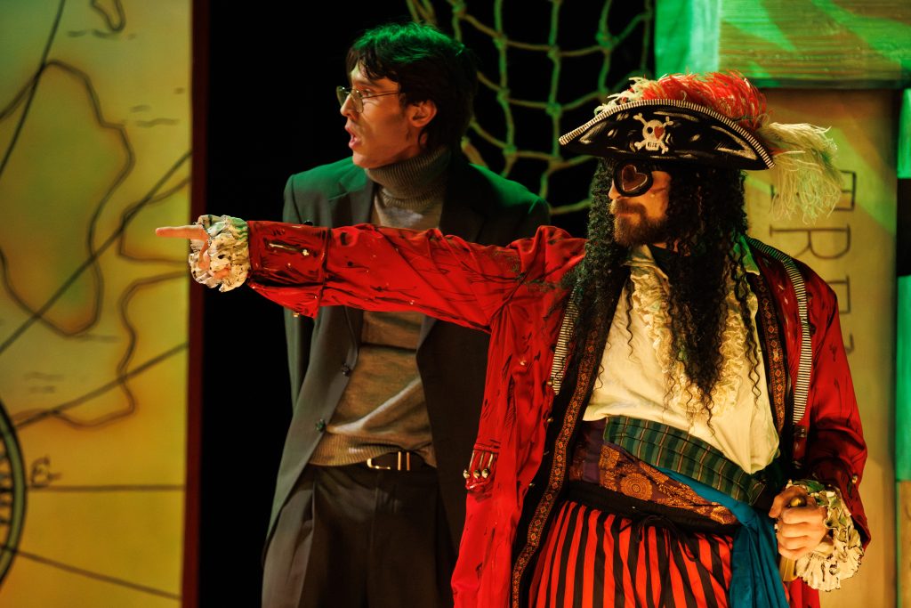 The production design is clever and visually engaging. The stage is framed by stacks of classic books like Moby Dick and Peter Pan, reinforcing the show’s literary roots. A moving pirate ship brings scenes to life, while creative lighting and shadow play—especially in the opening sequence—add a layer of theatrical magic.