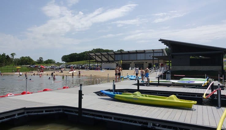 Lea McKeighan Park North, Lee’s Summit — This one-of-a-kind spray park resembles a giant pond. An oversized cattail and colorful flowers tower above you, spritzing out water. The sprayground also has several little fountains and interactive spray features. But the most striking feature of all is the enormous scorpion! This wily creature shoots water from its pincers and has a splash bucket instead of a stinger.