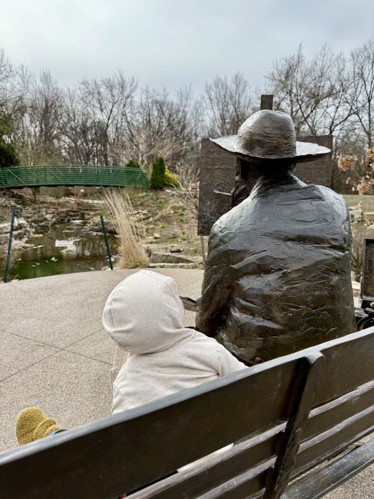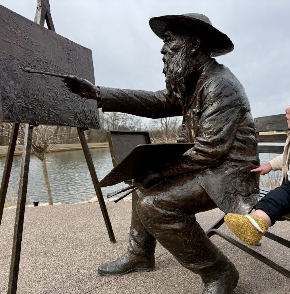 Looking off toward the bridge, a life-sized statue of Claude Monet captures the artist painting the view reminiscent of Bridge over a Pond of Water Lilies. Families are welcome to sit next to Monet on the bench for a photo opportunity.